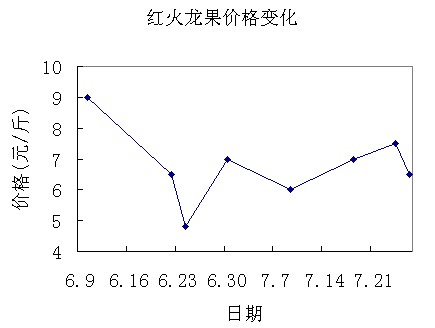 红心火龙果因其果肉红色,而区别于白心火龙果。红心火龙果在我国仅海南、广东、云南等省有种植,其中以海南种植的红心火龙果品质最优。因此长期以来,海南红心火龙果常常供不应示,价格也要高于内地的红心火龙果。自今年6月初上市以来,受到多种因素的影响,行情起伏跌宕,且涨跌幅度极大。其具体价格如下表: