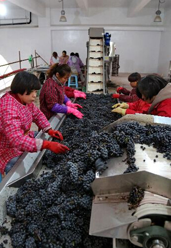 10月21日,工人在河北省昌黎县酒葡萄企业分检准备酿酒的酒葡萄。