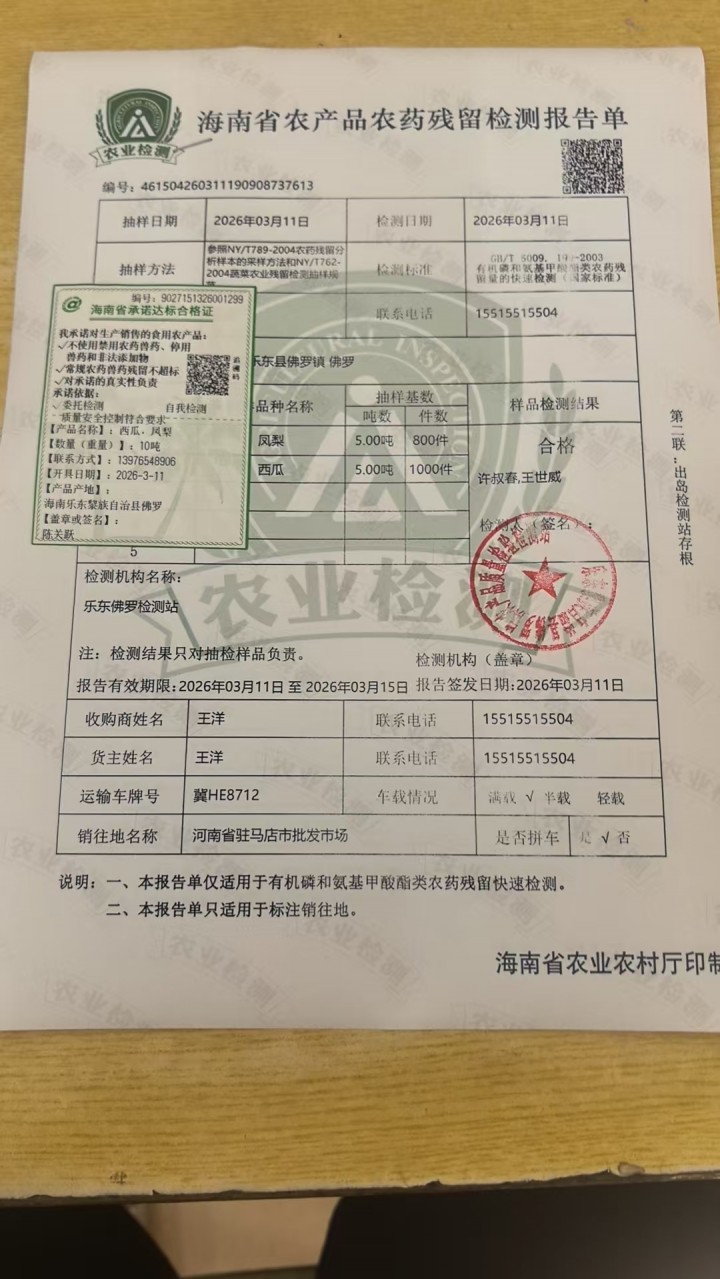 • 采收单位:海南富汇达农业开发有限公司