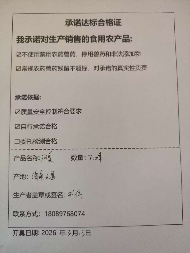 - 采收单位:海南富汇达农业开发有限公司