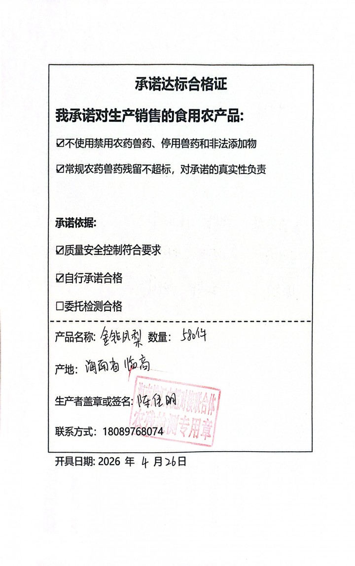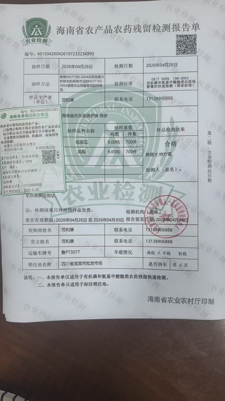 - 采收单位:海南富汇达农业开发有限公司